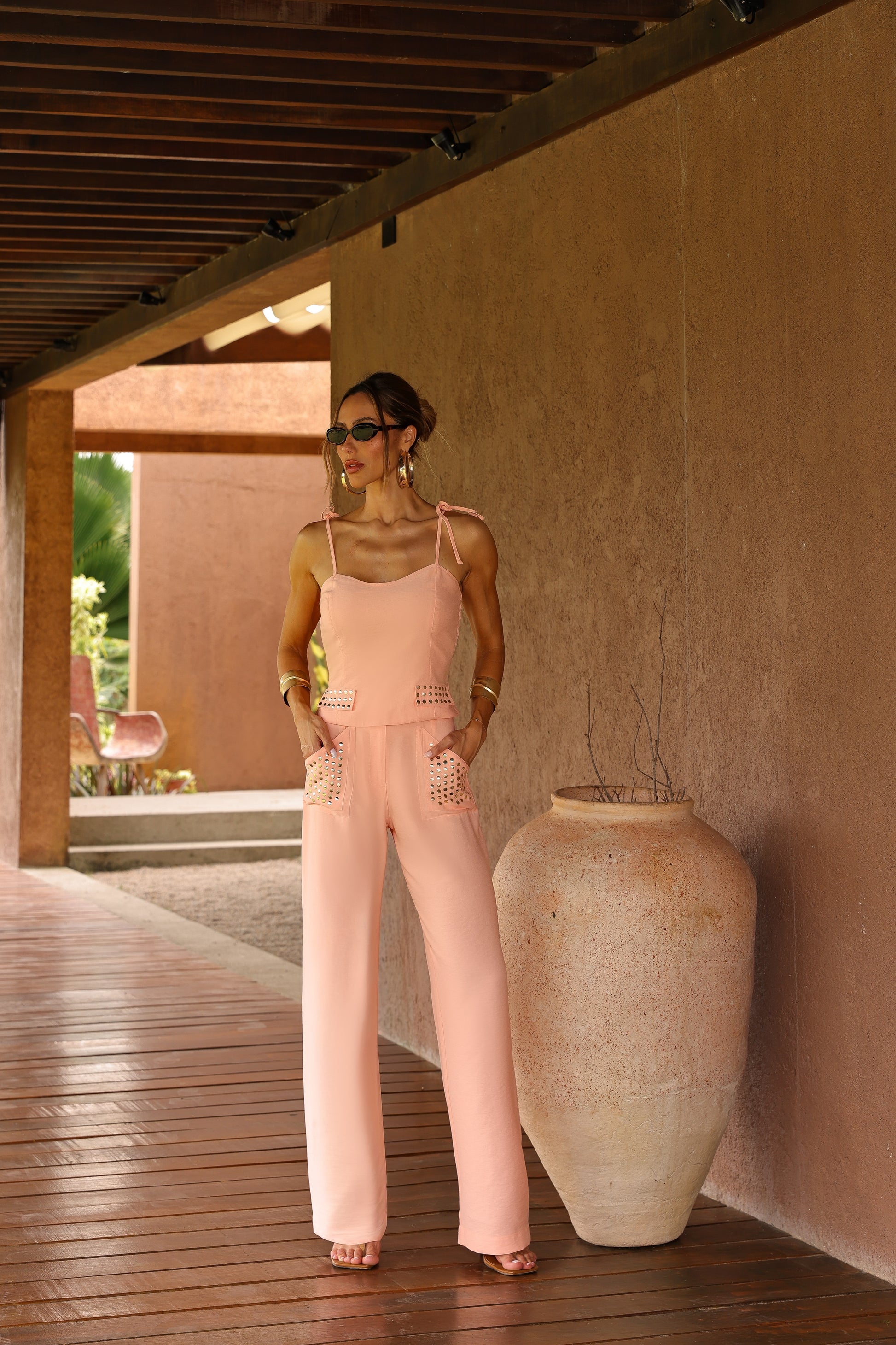 Set Karla combines understated elegance with everyday wearability. Crafted in soft peach pink with a smooth, refined material, this piece features expertly structured seams that create a tailored silhouette. Delicate gold stud accents adorn the top, adding a touch of sophistication without overwhelming the design. The careful balance between polished construction and relaxed comfort makes this set an effortless addition to any wardrobe.
